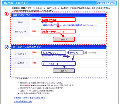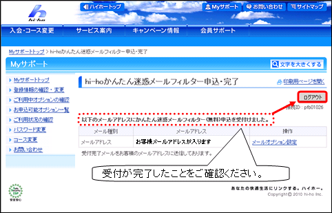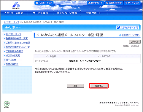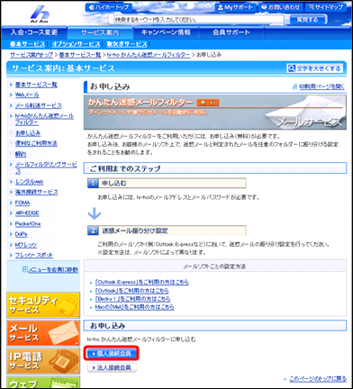 かんたん迷惑メールフィルターの申し込み手続き手順につきましてご説明いたします。 【ご注意ください】 画面構成は予告なく変更される場合がございます。 接続IDやパスワードが不明なお客様はこちらをご参照ください。 【手順1】かんたん迷惑メールフィルターのWEBページ(https://hi-ho.jp/service/mail/kmmf/)を開いてください。) 【手順2】最下部にある「お申し込みみ」をクリックしてください。 (画像:(https://i-ask464.dga.jp/dispImage.php?id=1749) 【手順3】かんたん迷惑メールフィルターの申し込み画面の最下部にある「個人接続会員」をクリックしてください。 (画像:(https://i-ask464.dga.jp/dispImage.php?id=1750) 【手順4】ログイン画面が表示されますので、接続IDまたはメールアドレスでログインしてください。 「①接続IDでログイン」または「②メールアドレスでログイン」のどちらでもOKです。 接続IDやパスワードを紛失された場合はこちらをご覧ください。 (画像:(https://i-ask464.dga.jp/dispImage.php?id=1751) 【手順5】迷惑メールフィルターを導入するメールアドレスの選択にチェックを入れて「内容確認へ」をクリックしてください。 (画像:(https://i-ask464.dga.jp/dispImage.php?id=1752) 【手順6】最終の申し込み確認画面です。「登録する」をクリックしてください。 (画像:(https://i-ask464.dga.jp/dispImage.php?id=1753) 【終了】以下画面が表示されれば申し込み終了です。→ログアウトしてください。 (画像:(https://i-ask464.dga.jp/dispImage.php?id=1754)