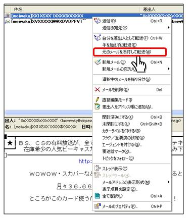 かんたん迷惑メールフィルターをすり抜けて「通常メール」と判定される迷惑メールにつきましては、該当のメールを弊社に提供いただき、フィルターのプログラム開発元事業者(カスペルスキー社)にて解析することで、精度を向上させます。 以下のリンクをクリックしていただき、表示されたページ下部の「その他のお問い合わせ」より「迷惑メールの申告」を選択いただき、表示された手順・注意事項をお読みいただいた上で、該当のメールを弊社まで転送ください。 【お問い合わせページへのリンク】 なお、メールを転送いただく際は、該当メールを添付して転送する方式でお願いいたします。 主要なメールソフトで「メールを添付して転送する」方法を以下に掲載します。 ↓↓メールの転送方法↓↓ ①マイクロソフト系(アウトルックやWindows Liveメール)の場合 該当のメールを右クリックし、表示されたメニューから「添付ファイルとして転送」を選択します。 (画像:(https://i-ask464.dga.jp/dispImage.php?id=1747) ②Becky!の場合 該当のメールを右クリックし、表示されたメニューから「元のメールを添付して転送」を選択します。 (画像:(https://i-ask464.dga.jp/dispImage.php?id=1748)